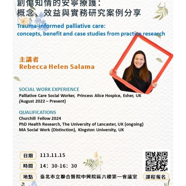 活動內容:邀請英國資深安寧社工Rebecca Salama至臺北市立聯合醫院講授創傷知情於安寧療護之運用,並有實例分享,讓與會成員除了概念的理解外,也能清楚知道如何與實務結合。活動對象:醫務社會工作人員、對該議題感興趣之相關專業人員