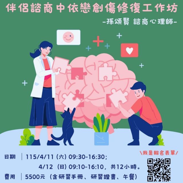 本工作坊可申請諮商心理師繼續教育積分(人數未達3人不申請),如有任何問題歡迎來電洽詢唷!