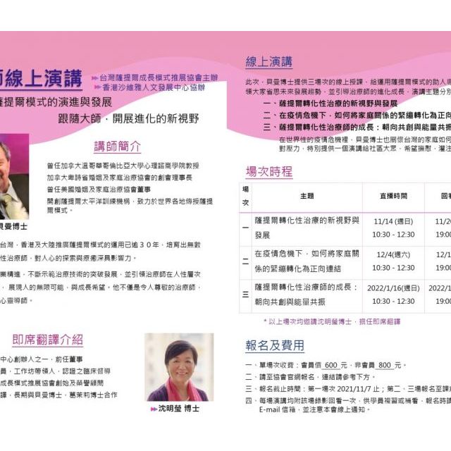 這場次貝曼博士將分享他對人性轉化成長的新看見,及人無限可能的可工作的方向,幫助心理工作者能有清晰的哲理架構與工作模圖。