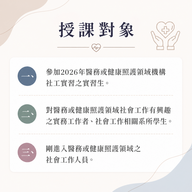 2.對醫務或健康照護領域社會工作有興趣之實務工作者、社會工作相關系所學生。