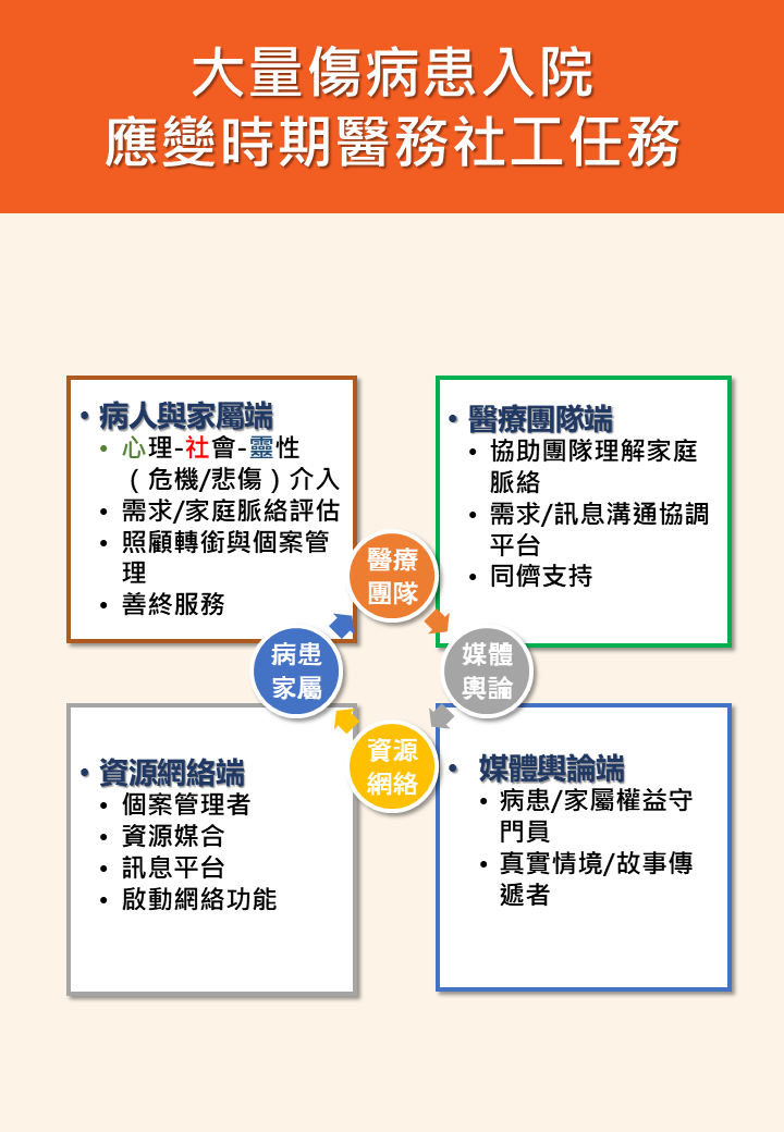 推出了醫務社會工作緊急災難應變實務方法,針對大量傷患入院時醫務社工的應變流程、角色任務以及如何運用危機介入、個案管理方式進行處遇,也期待這些的應用指南能夠協助醫務社工面對重大事件的風暴,提供社工夥伴更多的處遇策略以及工作面向