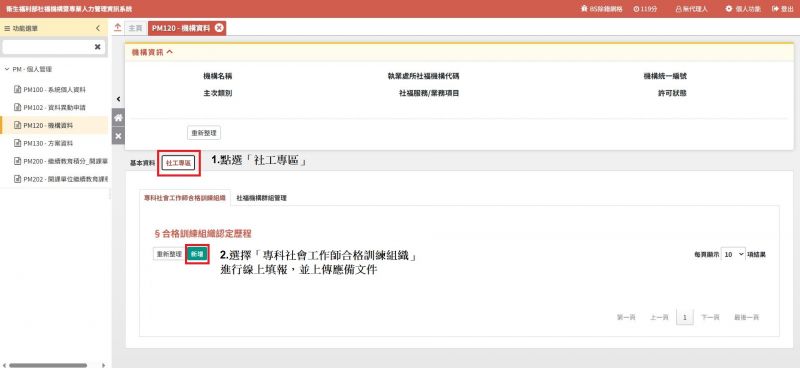 ★本年度採線上申請。請申請單位至「衛生福利部社福機構暨專業人力管理資訊系統」(請點我前往),點選「PM120-機構資料」功能 > 進入「社工專區」分頁 > 選擇「專科社會工作師合格訓練組織」進行線上填報,並上傳應備文件,詳細應備文件請參考申請簡章(申請單位應先申請機構帳號,已有帳號者免重覆申請帳號)。